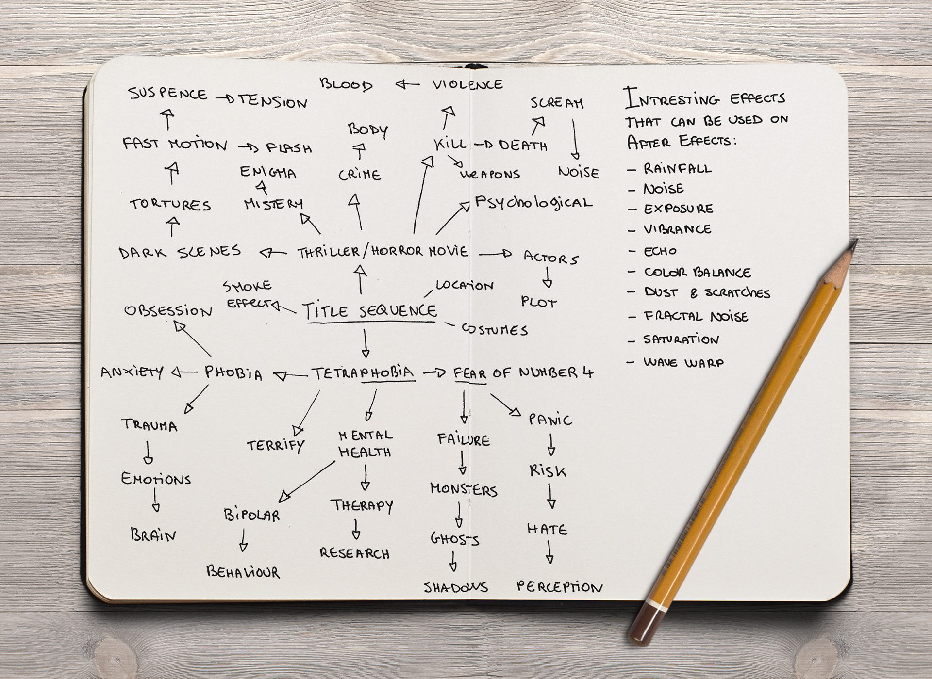 Mind maps, sketches and thumbnails are an essential component of any design process. In the case of this project, the process started with the creation of a mind map, which helped me to identify useful keywords and the topic I would cover in the title sequence. Then I imagined the story I wanted to tell and a potential title for my video. Through the drawing of a series of thumbnails, I recreated the main scenes of the video and helped me to understand any possible gaps or mistakes in the development of the story. All the scenes were then re-created and edited using After Effects.
